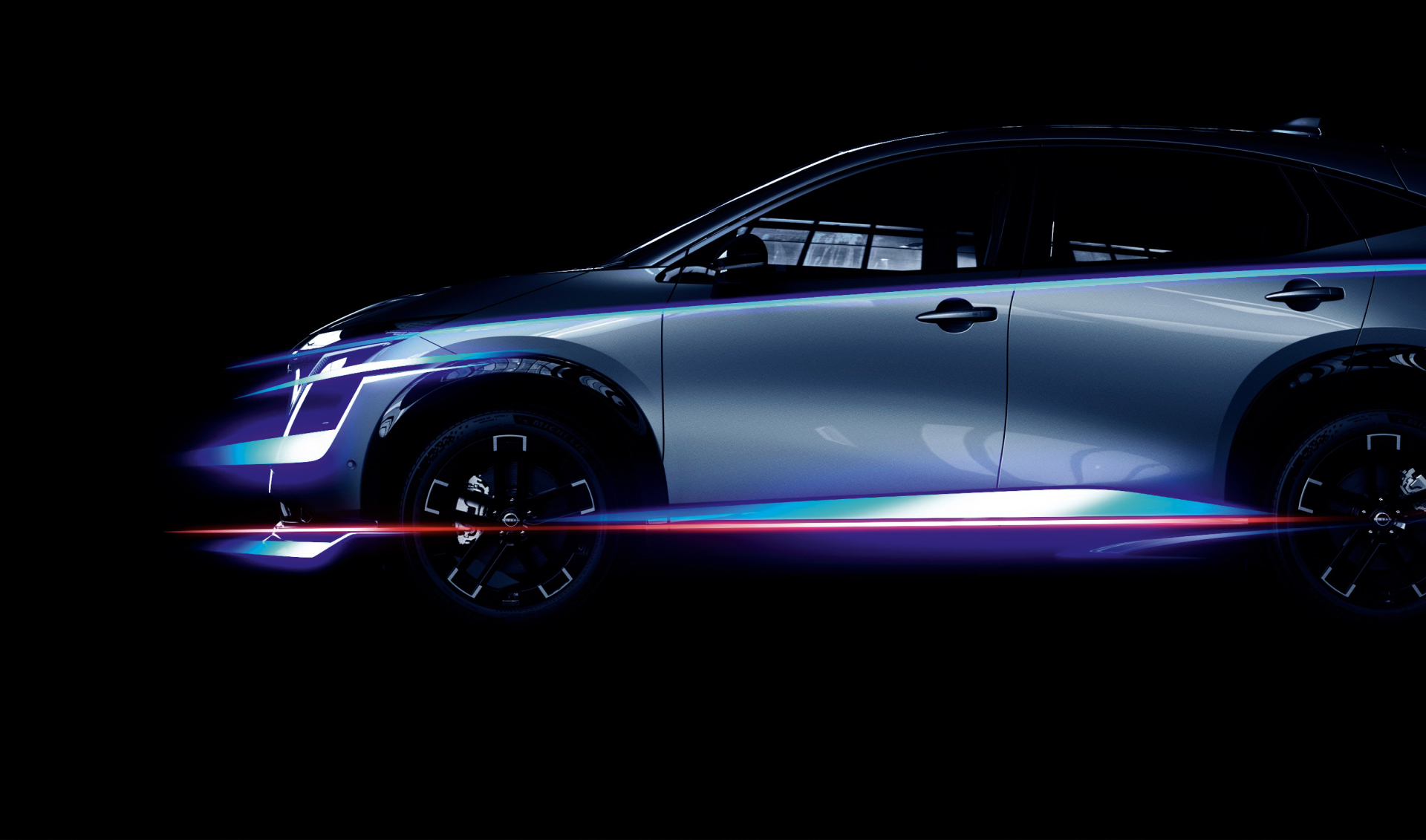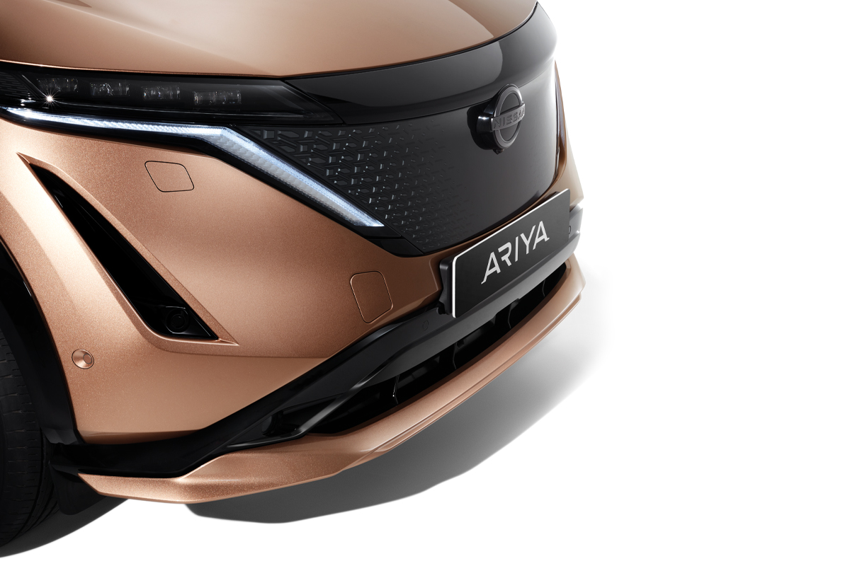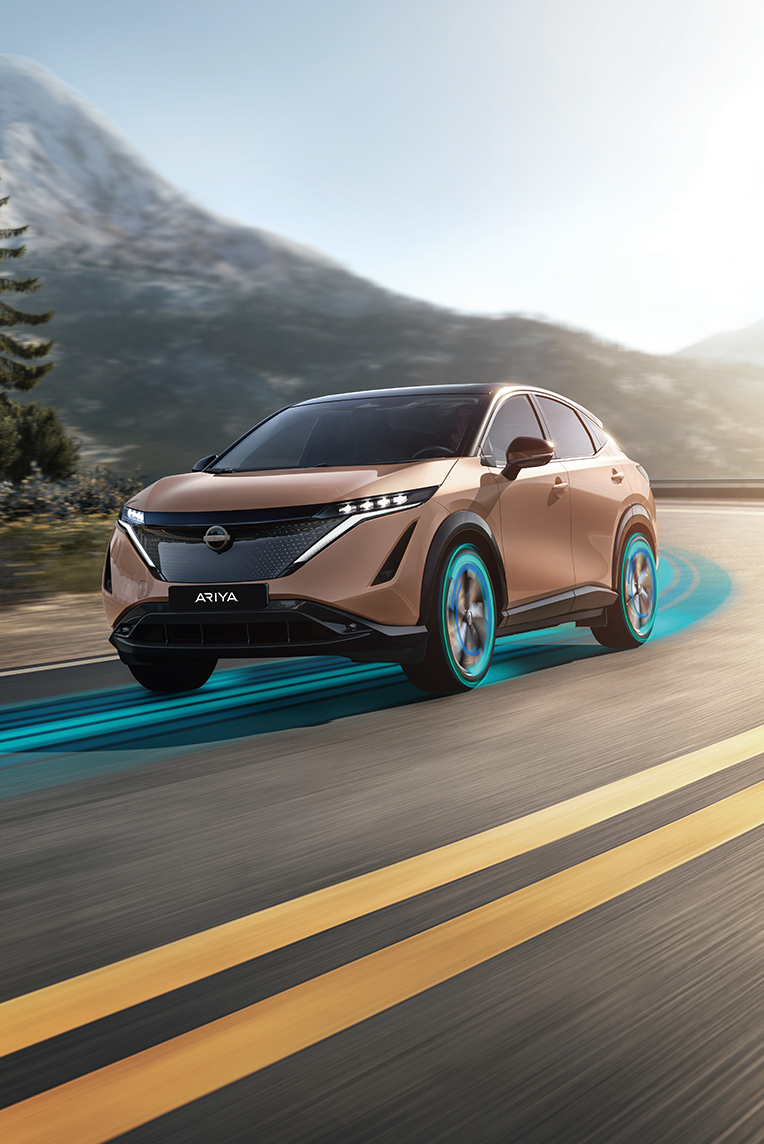 Nissan ARIYA on jalustrabav Nissani uue visiooni kehastus. Üksik horisondijoon asendab detailirohkeid kontuure. Kitsad LED-esituled säravad öösel ja peituvad päeval. Lame põrand lisab avarust ja tekitab mõnusa atmosfääri.