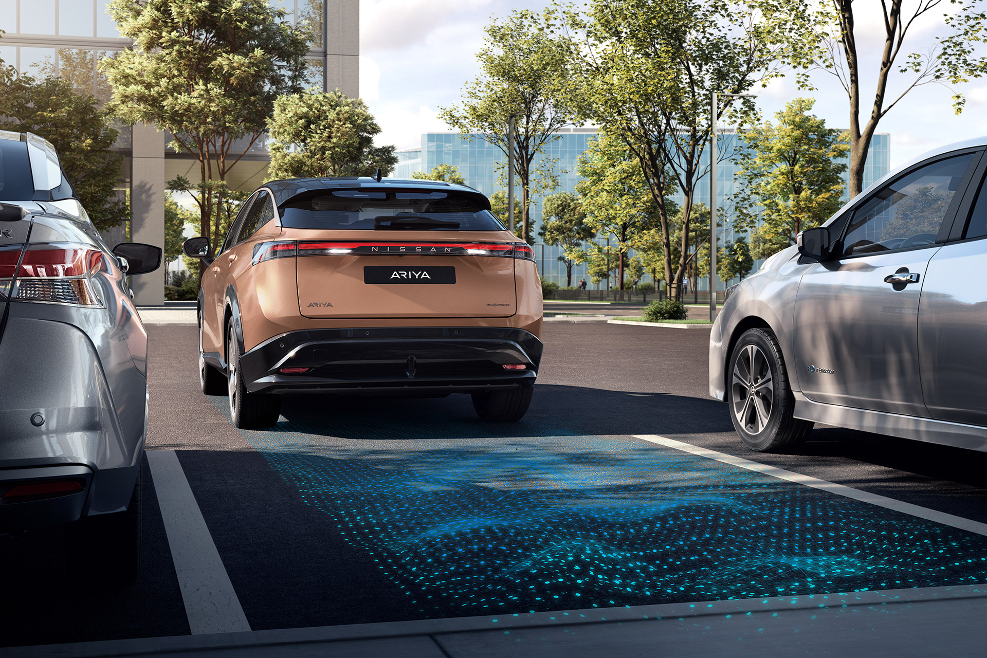 - Nissan ARIYA pakub ka tehnoloogiaid, mis aitavad näiteks külgboksi parkimisel. Vajutage ProPILOT Parki nuppu ning Nissan ARIYA teeb ülejäänu. [7] [8]