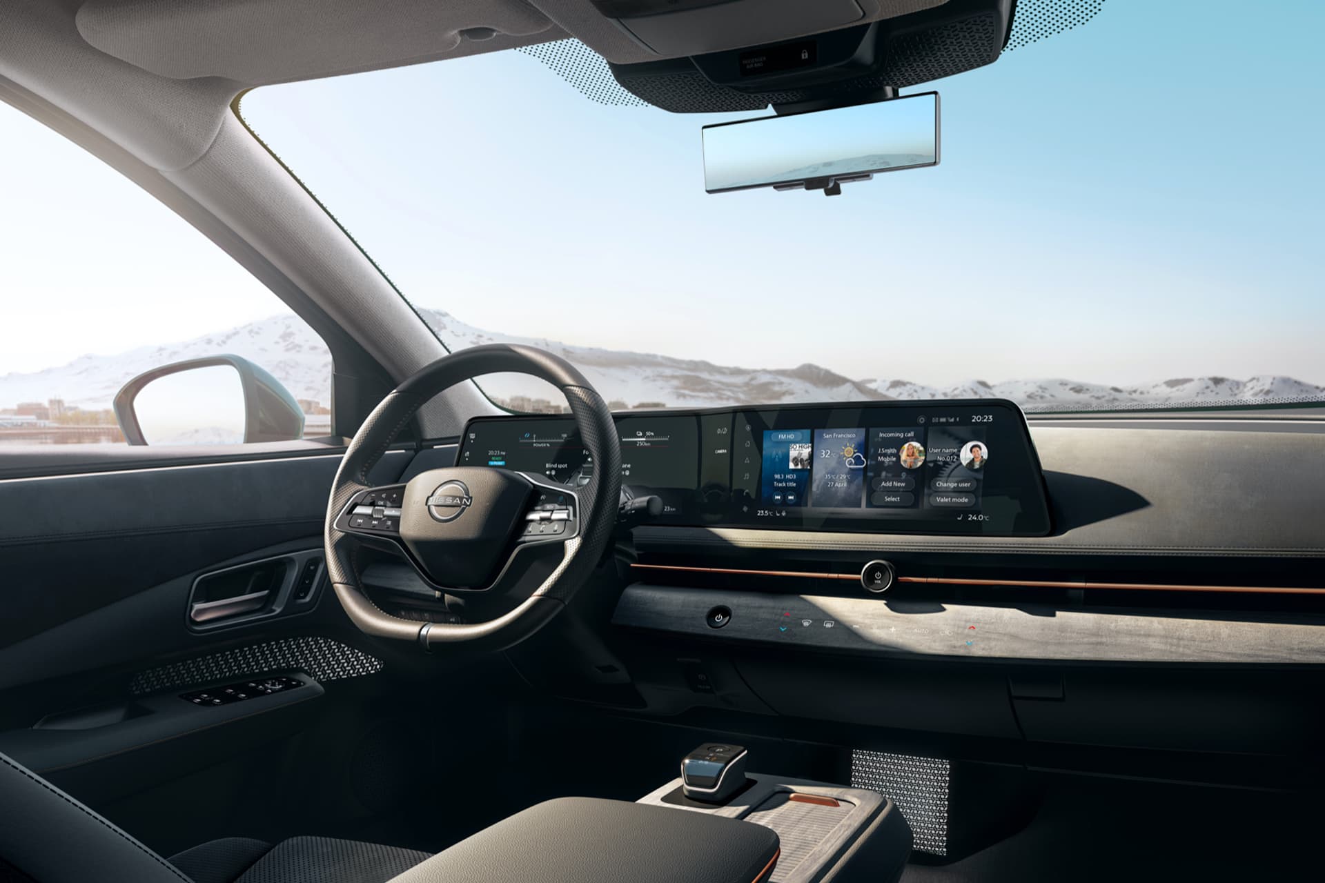 Nissan ARIYAl on kaks 12,3-tollist HD-digiekraani (integreeritud kuvaliides), mille kaudu saate kasutada kõiki info -ja meelelahutuse funktsioone.