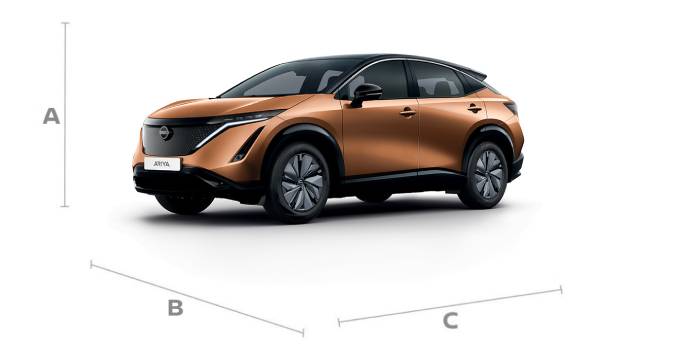 Nissan ARIYA kuulub keskklassi linnamaasturite hulka. Selle kogupikkus on 4595 mm, laius 1850 mm ja kõrgus 1660 mm.[4]